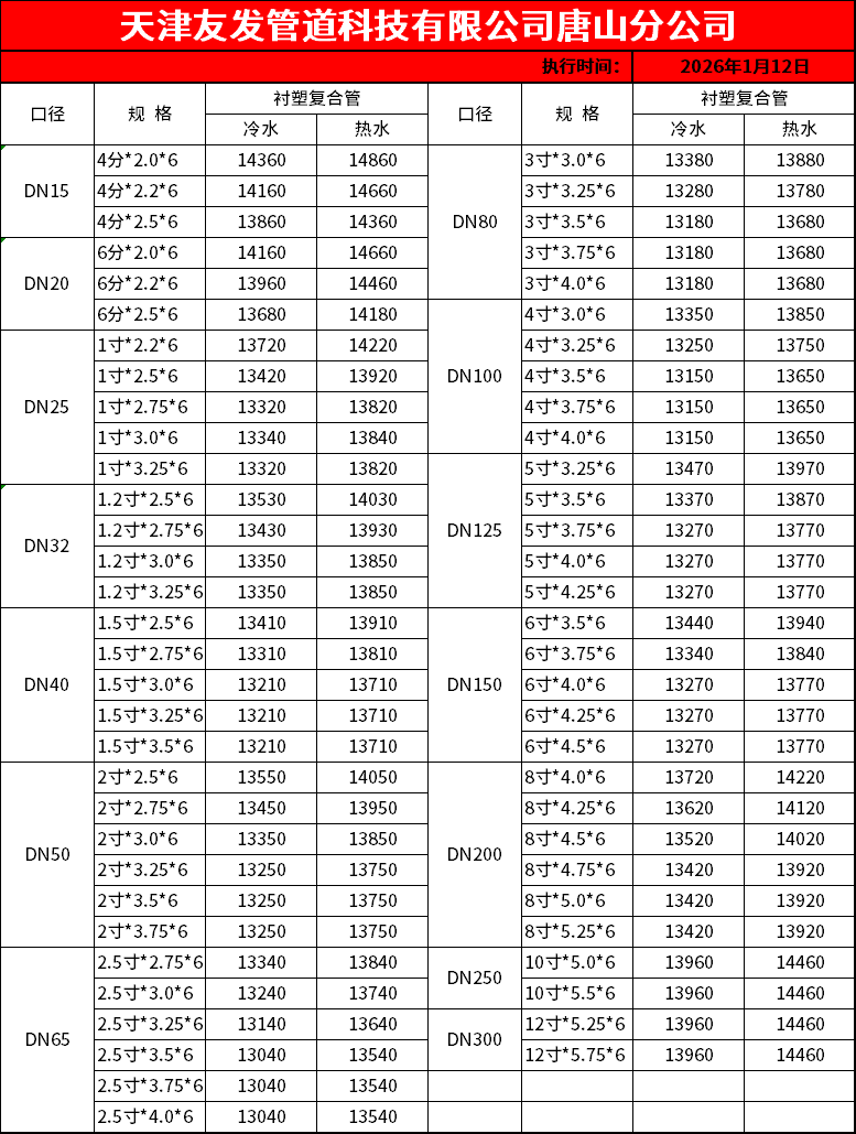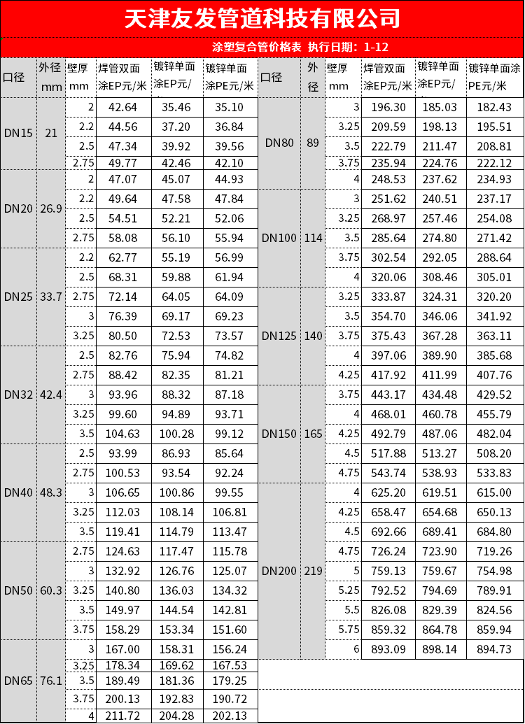 <b style="font-size: 16px;color: rgba(220, 7, 7, 1);">涂塑复合钢管</b><br/> 规格尺寸:DN15~DN3400<br/> 执行标准:GB/T28897:CJ/T136:CJ/T120:GB/T5135.20:GB/T 42541:GB/T 37594:GB/T 23257<br/> 产品用途:广泛应用于消防供水系统、建筑给水输送、化工流体输送、穿线保护、燃气管道输送等领域<br/> <b style="font-size: 16px;color: rgba(220, 7, 7, 1);">衬塑复合钢管</b><br/> 规格尺寸:DN15~DN600<br/> 执行标准:GB/T 28897;CJ/T 136<br/> 产品用途:用于市政工程、工业工程、农林灌溉、高速公路、海洋工程等<br/> <b style="font-size: 16px;color: rgba(220, 7, 7, 1);">建筑排水钢塑复合短螺距内螺旋管材</b><br/> 规格尺寸:DN80~DN200<br/> 执行标准:CJ/T 488<br/> 产品用途:可用于建筑排水系统、工业废水处理系统、城市污水处理系统