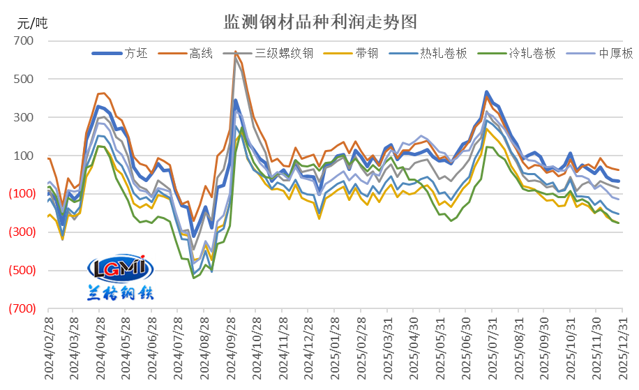 从四周库存原料测算的各钢材品种毛利表现来看,2025年12月整体呈现“先升后降”的震荡态势,不同品类盈利分化特征显著,其中建材品种盈利略有改善,其余品种盈利则持续转弱。据兰格钢铁研究中心监测数据显示,在纳入监测的七大钢材品种中,高线、螺纹钢的月均毛利较上月改善,改善幅度介于9-12元/吨之间;而其余品种的月均毛利均呈减弱态势,减弱幅度在36-70元/吨区间,品种间盈利分化格局进一步凸显。