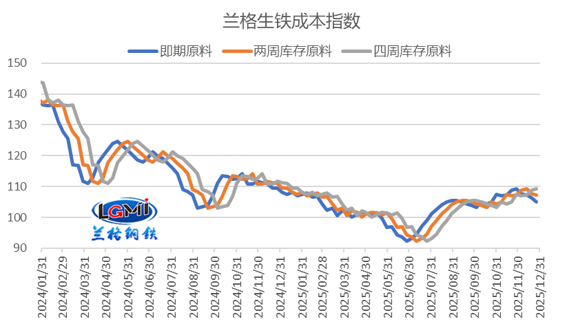 2025年12月,原料市场呈现结构性调整态势,铁矿石价格逐步趋稳,焦炭价格则持续下行,带动不同库存周期下的原料成本出现分化。据兰格钢铁研究中心监测数据显示,12月份即期原料测算生铁成本指数为106.6,较上月同期下降1.4%;两周库存原料测算生铁成本指数为108.3,较上月同期上升1.5%;四周库存原料测算生铁成本指数为108.1,较上月同期上升2.5%,不同库存周期下的成本差异进一步显现。
