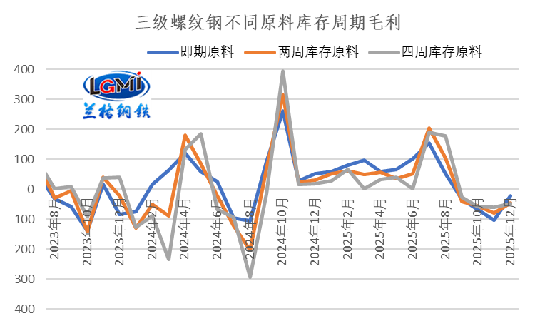 从三级螺纹钢盈利表现来看,2025年12月其盈利状况较上月呈现改善态势,不同原料库存周期下的吨钢毛利均实现减亏。具体来看,即期原料测算月均毛利为-21元/吨,较上月减亏81元/吨;两周库存原料测算月均毛利为-45元/吨,较上月减亏35元/吨;四周库存原料测算月均毛利为-49元/吨,较上月减亏10元/吨,行业盈利压力得到一定缓解(详见图2)。
